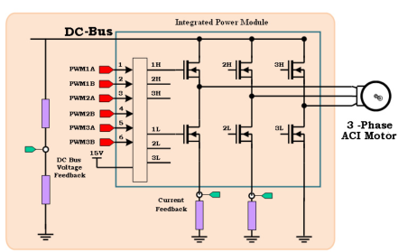 ADP32Fx 的 PWM 模塊運(yùn)用 SVPWM 技術(shù)產(chǎn)生 6 個(gè)脈寬調(diào)制(PWM)信號(hào),用于驅(qū)動(dòng) 6 個(gè)功率開(kāi)關(guān)器件。ADC 模塊采樣電機(jī)兩個(gè)相線(xiàn)的電流信號(hào) Ia 和 Ib。通過(guò)電阻分壓的方式將直流母線(xiàn)的電壓送到芯片的 AD 引腳。