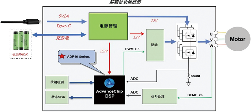 筋膜槍解決方案基于進(jìn)芯ADP16F03系列高性?xún)r(jià)比16位DSP芯片,實(shí)現(xiàn)手持筋膜槍的多種智能控制。