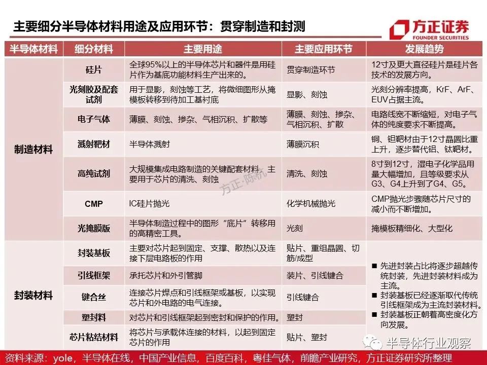 在晶圓制造工藝中,主要用料為硅片、靶材、拋光材料、光刻膠、高純化學試劑、電子特氣和化合物半導體,其中,硅片、電子特氣、光掩膜版、拋光材料等用量較大;在封裝測試中,主要材料為封裝基板、引線框架、陶瓷封裝體和鍵合金屬線,其中,封裝基板、鍵合絲等是較為主要的材料。