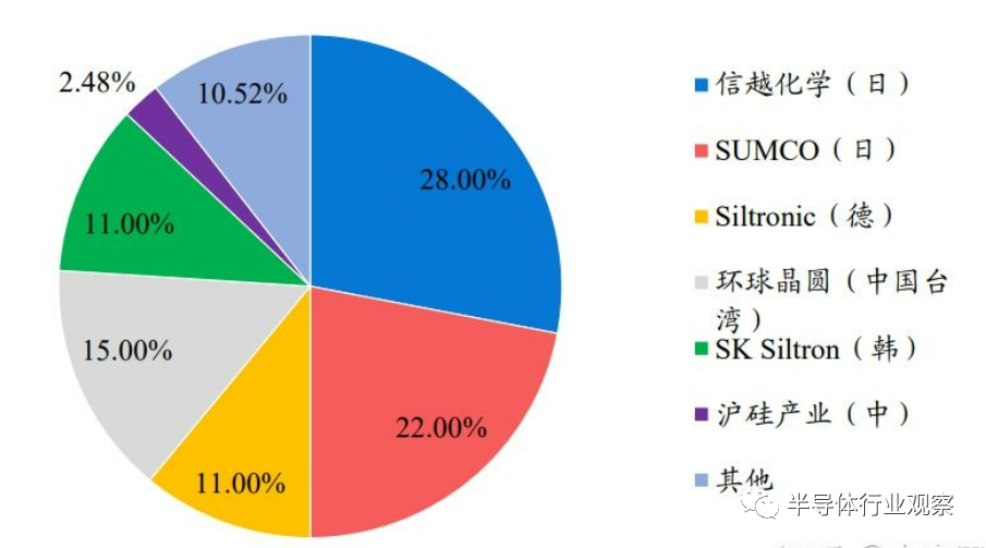 在硅片市場中,日本信越化學占比28%,SUMCO占比22%,中國臺灣的環(huán)球晶圓占比15%,德國Siltronic占比11%,韓國SK Siltron占比11%。前五大廠商共占據(jù)87%的市場份額,細分市場集中度較高。