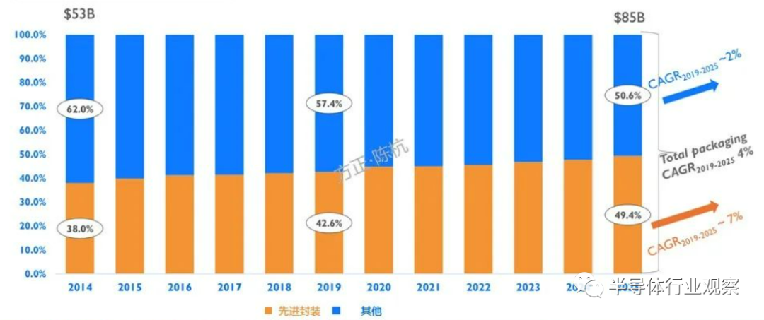 近年來在電子基板中,高密度多層基板占比越來越大,在先進封裝中的運用越來越廣泛。根據(jù)Yole數(shù)據(jù)顯示,全球封裝收入年復合增長率為4%,其中先進封裝市場的年復合增長率達7%,預計到2025年先進封裝收入將達到422億美元,封裝市場占比接近50%。