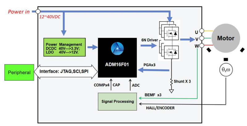 進芯電子推出的ADM16F01是一款高度集成的高性能BLDC/PMSM控制器,它采用高性能16位CPU,最高工作頻率為40MHZ。