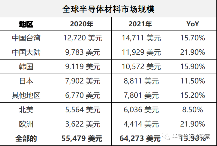 其中,中國大陸2021年半導(dǎo)體材料的市場(chǎng)約為119.3億美元,同比增21.9%。