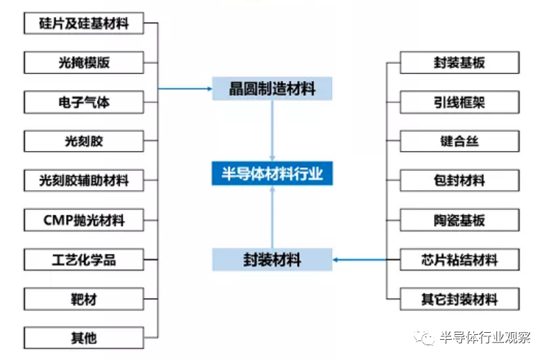在晶圓制造工藝中,主要用料為硅片、靶材、拋光材料、光刻膠、高純化學(xué)試劑、電子特氣和化合物半導(dǎo)體,其中,硅片、電子特氣、光掩膜版、拋光材料等用量較大;在封裝測(cè)試中,主要材料為封裝基板、引線框架、陶瓷封裝體和鍵合金屬線,其中,封裝基板、鍵合絲等是較為主要的材料。