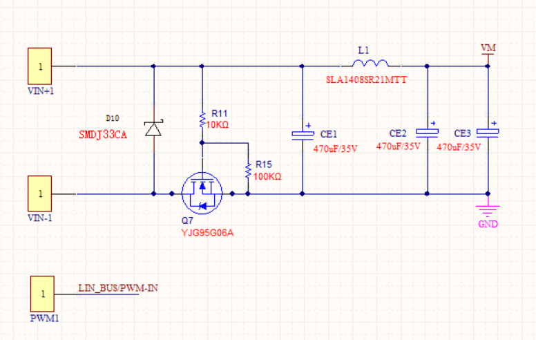 電路模塊主要包括: 輸入防反及濾波電路部分、24V轉(zhuǎn)12V系統(tǒng)供電電路(24V方案)、ADM16F03A2最小系統(tǒng)、功率橋電路、ADC母線電壓采樣電路、單電阻采樣運放采樣電路、自舉電路和PWM/LIN通訊反饋電路。