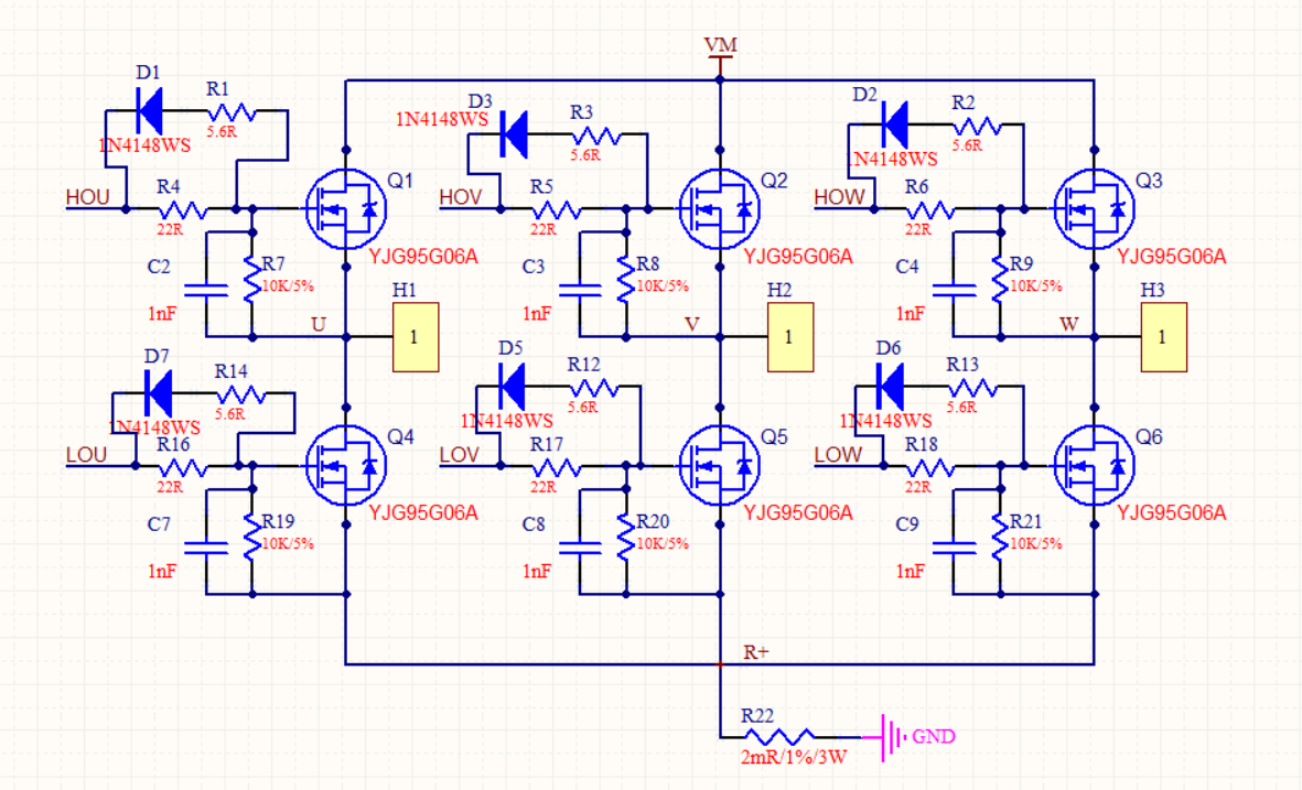功率橋電路采用上下管均為NMOS的配置,總計6個NMOS組成三相半橋驅(qū)動電路。