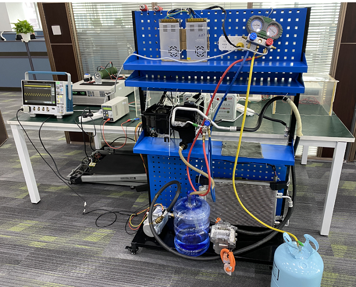 進(jìn)芯電子實(shí)驗(yàn)室具備汽車空調(diào)壓縮機(jī)帶負(fù)載測試條件,可以實(shí)現(xiàn)自由更換壓縮機(jī)、背壓、平衡壓等測試條件,下圖是進(jìn)芯電子壓縮機(jī)測試平臺。